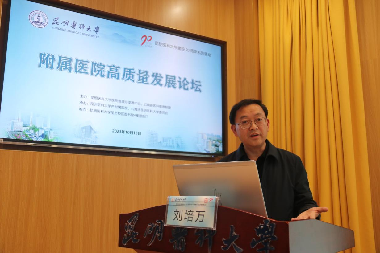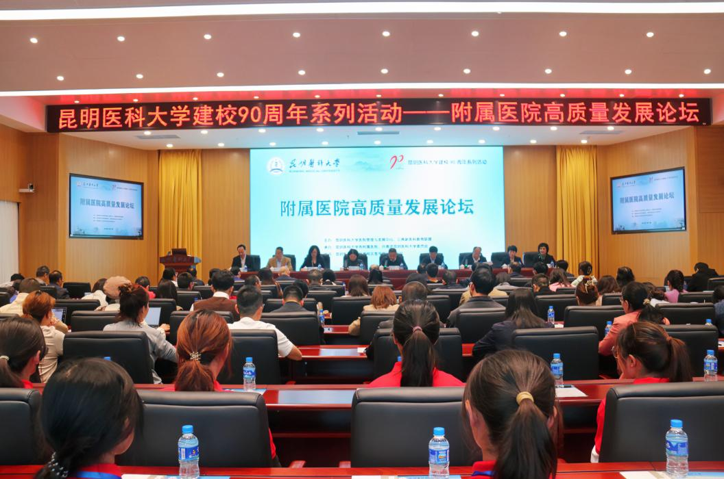 10月13日,昆明医科大学建校90周年系列活动——附属医院高质量发展论坛在呈贡校区图书馆报告厅举办。该论坛由昆明医科大学医院管理与发展中心、云南新医科教育联盟主办,昆明医科大学各附属医院、共青团昆明医科大学委员会共同承办。来自省内外高校附属医院的管理者、专家学者、领导及工作人员近140人齐聚一堂,共同探讨新时代背景下附属医院高质量发展路径,为学校90周年华诞献礼。