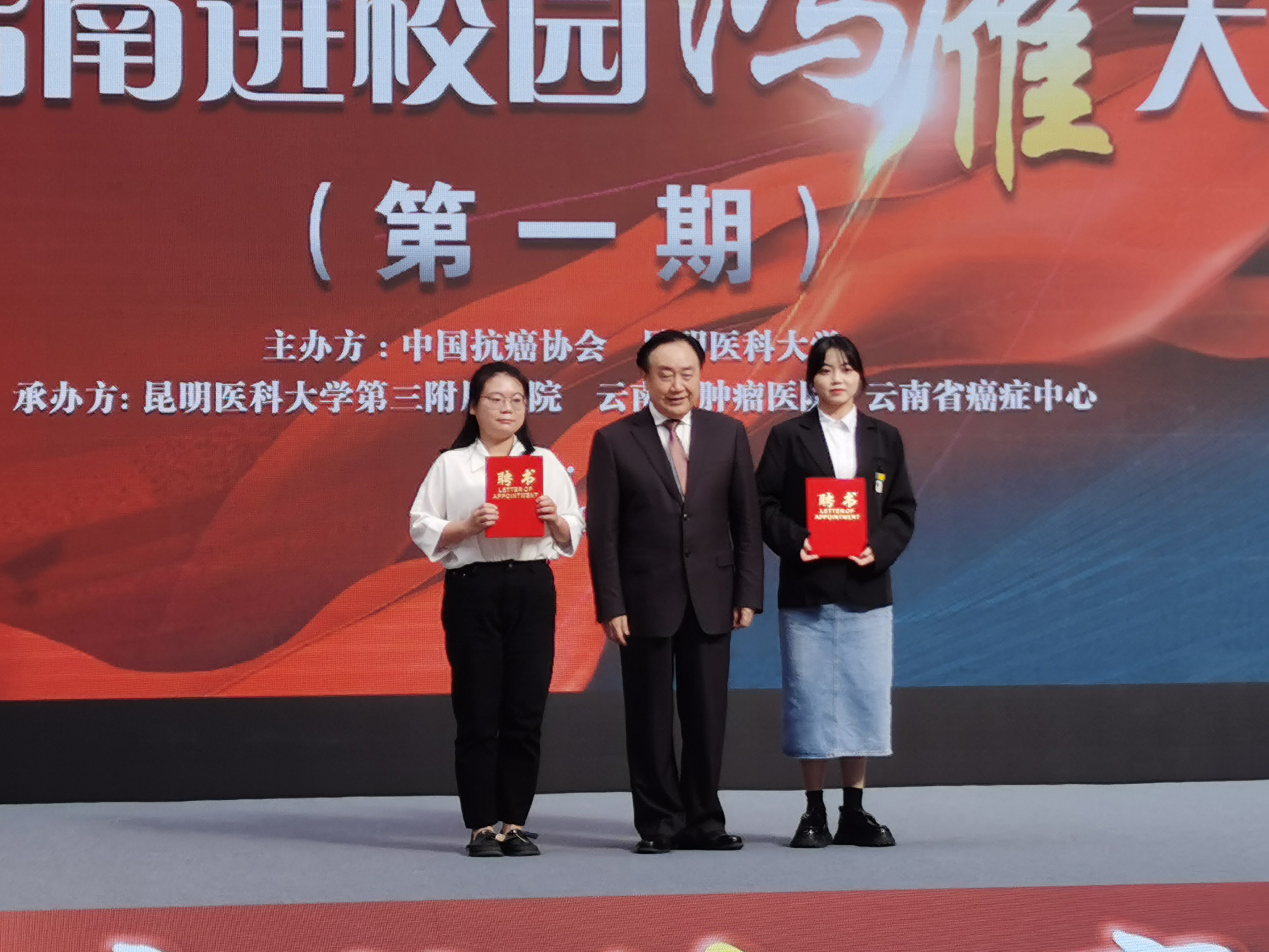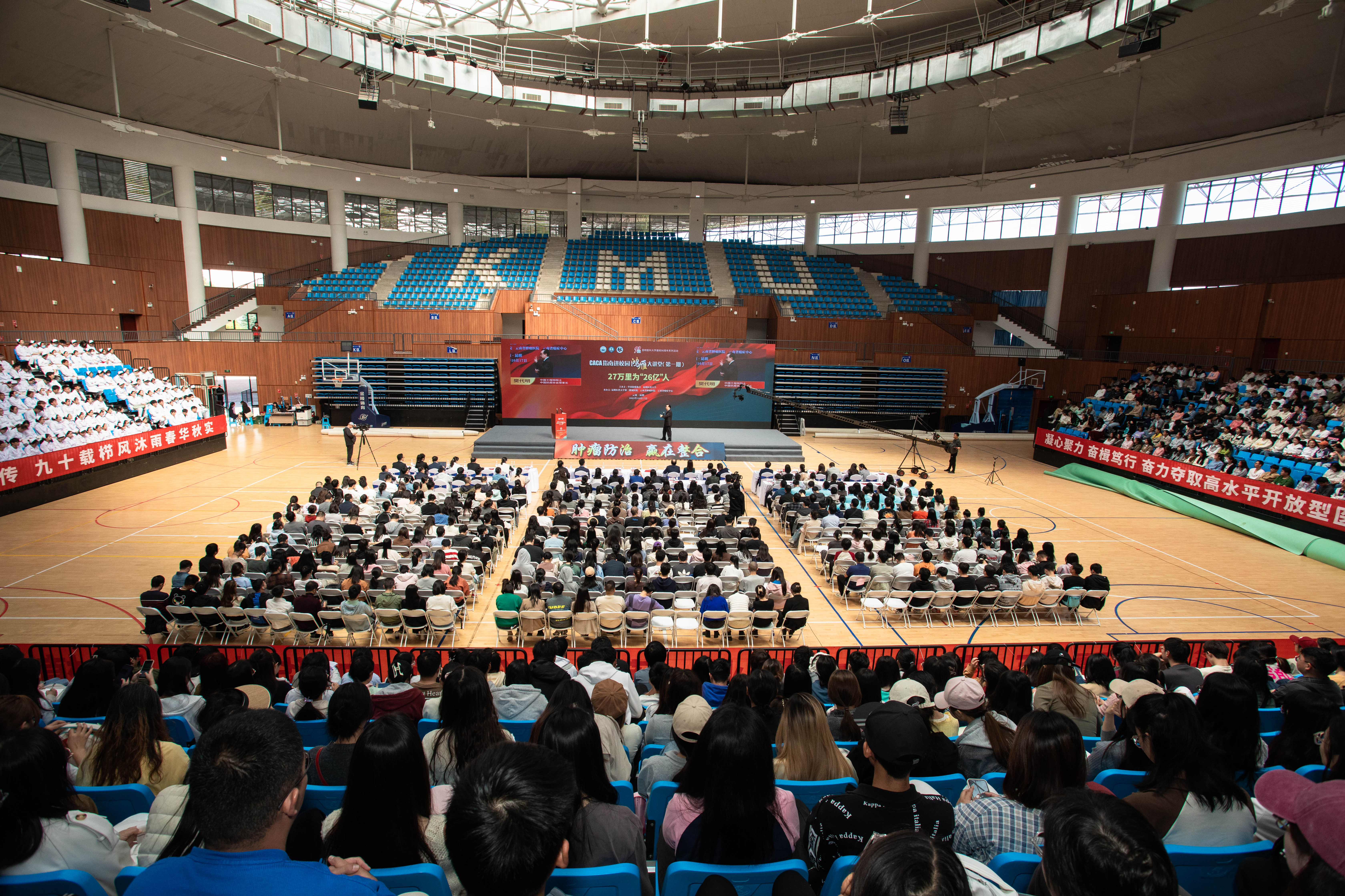 首发仪式后,昆明医科大学建校90周年系列活动之CACA指南进校园“鸿雁”大讲堂(第一期)在南苑体育馆开讲。樊代明院士用翔实的数据为大家带来了精彩的讲座《27万里为“26亿”人》,并为昆明医科大学CACA学生会员部部长李艺楠、郑霞颁发聘书。