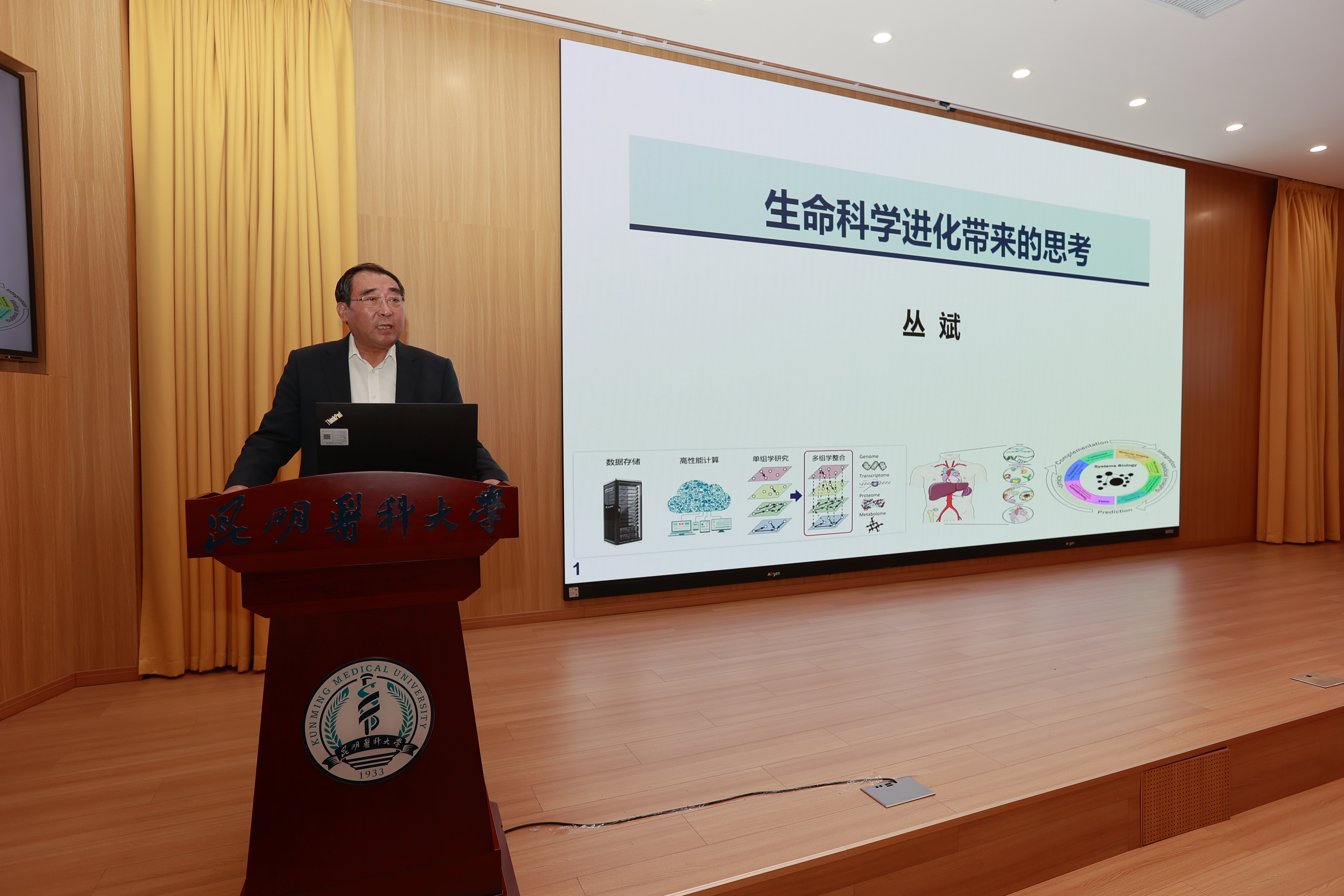 在呈贡校区图书馆报告厅,中国工程院院士、九三学社中央副主席丛斌作《生命科学进化带来的思考》主题报告。