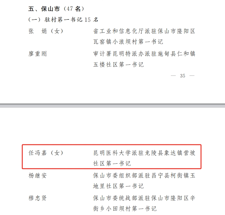 近日,中共云南省委组织部和云南省乡村振兴局联合下发表彰通知,对云南省984名2021—2023年优秀驻村第一书记和工作队员予以通报表扬。昆明医科大学派驻龙陵县象达镇营坡社区第一书记、护理学院任冯嘉为受表扬的优秀驻村第一书记。