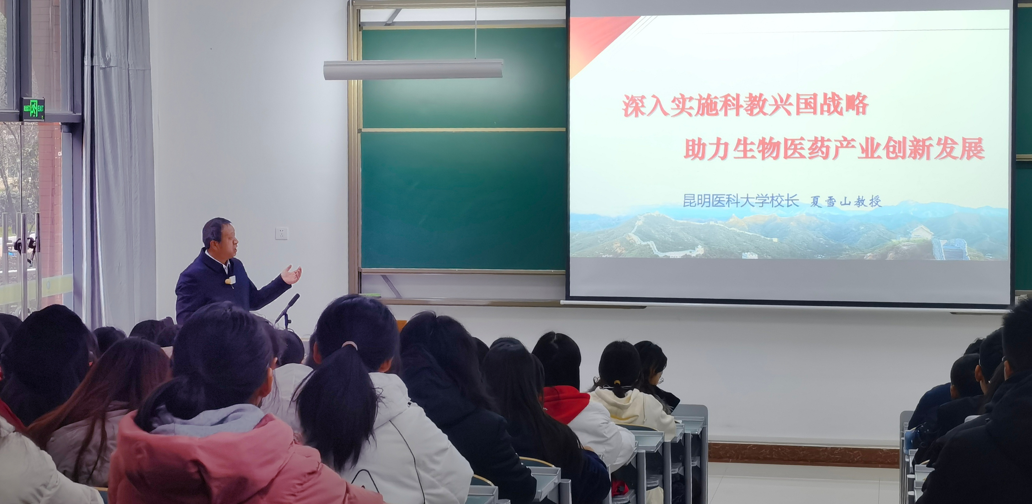 12月21日上午,昆明医科大学校长夏雪山教授走进2023级临床医学八大班和全科医学一大班课堂,以“深入实施科教兴国战略、助力生物医药产业创新”为主题,为同学们带来了一堂精彩的思政课。