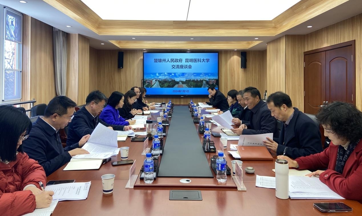 1月5日上午,楚雄州人民政府副州长陈翡敏、楚雄医药高等专科学校校长张颖,楚雄州有关单位负责人等一行到昆明医科大学开展交流座谈。昆明医科大学校长夏雪山,党委常委、副校长李利华及相关职能部门负责人参加座谈。