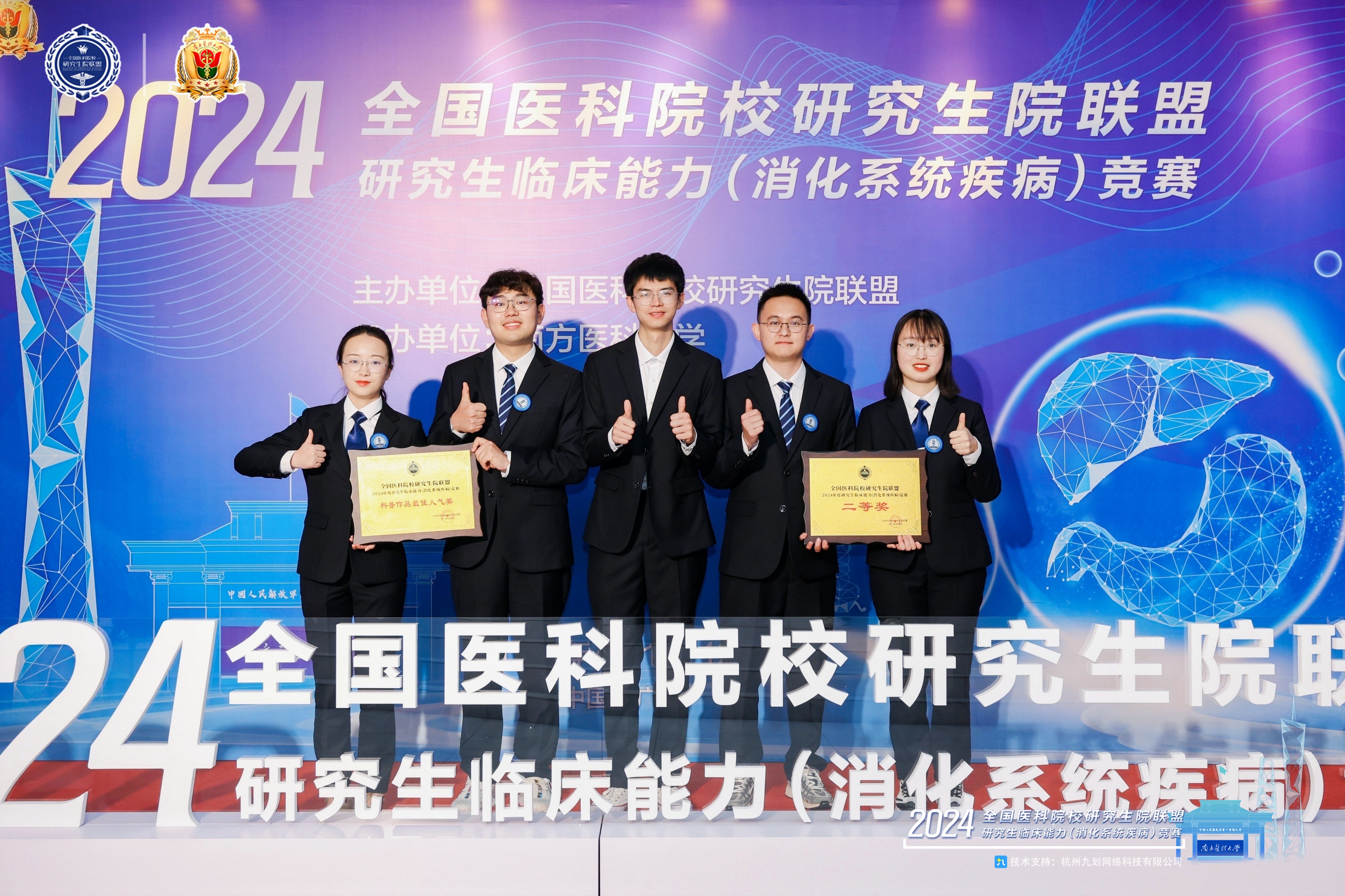 本次竞赛分为初赛、复赛、决赛3个阶段。初赛设置了临床理论考核,我校以第5名的成绩顺利晋级。复赛设置了临床病例汇报、临床科研课题设计以及科普作品比赛,临床病例汇报环节,我校以《非同寻“肠”——血便之辩》为题,展示了以下消化道出血为主要表现的缺血性肠炎患者的诊治过程;临床科研课题设计环节,我校研究方案《生活方式对代谢功能障碍相关脂肪变性肝病(MASLD)发生风险的关联性研究》得到了评委的高度评价;科普作品比赛环节,我校作品《时空医鉴——胆囊结石并胆囊炎的中西医诊治》以第3名的成绩获得科普作品最佳人气奖。经过初赛和复赛成绩的累加,我校以第7名的成绩顺利晋级决赛。经过决赛的思维与技能操作比赛的角逐,最终我校荣获团体二等奖。