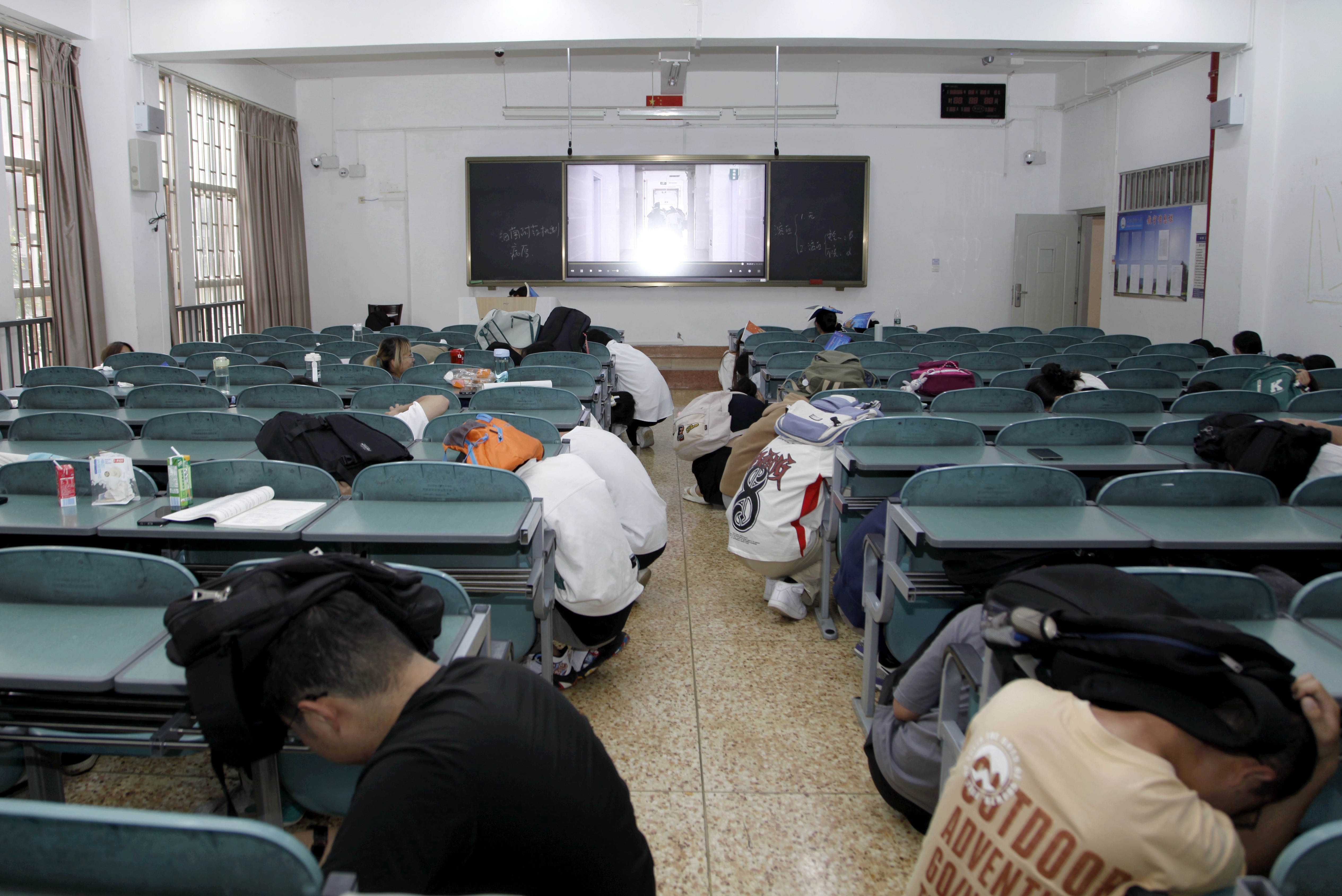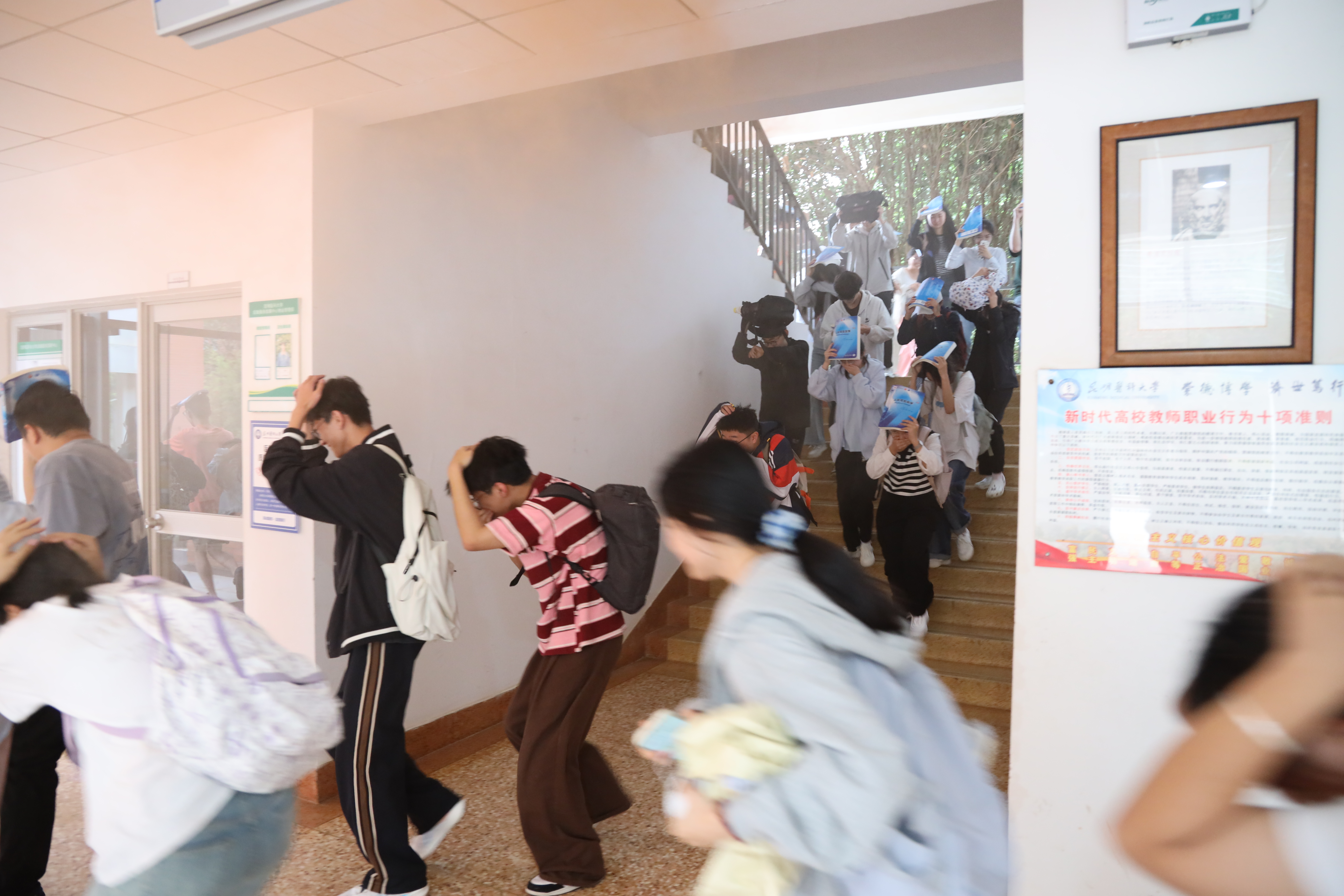 11时40分,随着“演练开始”口令发出,演练现场警报声、模拟地震音效声响起,模拟灰尘的烟雾弹在各教学楼燃放,师生们立即就近躲在桌子、墙角等坚固的掩护体下,并紧紧抓牢可利用物体,进行紧急避震。同时,学校迅速启动应急预案。