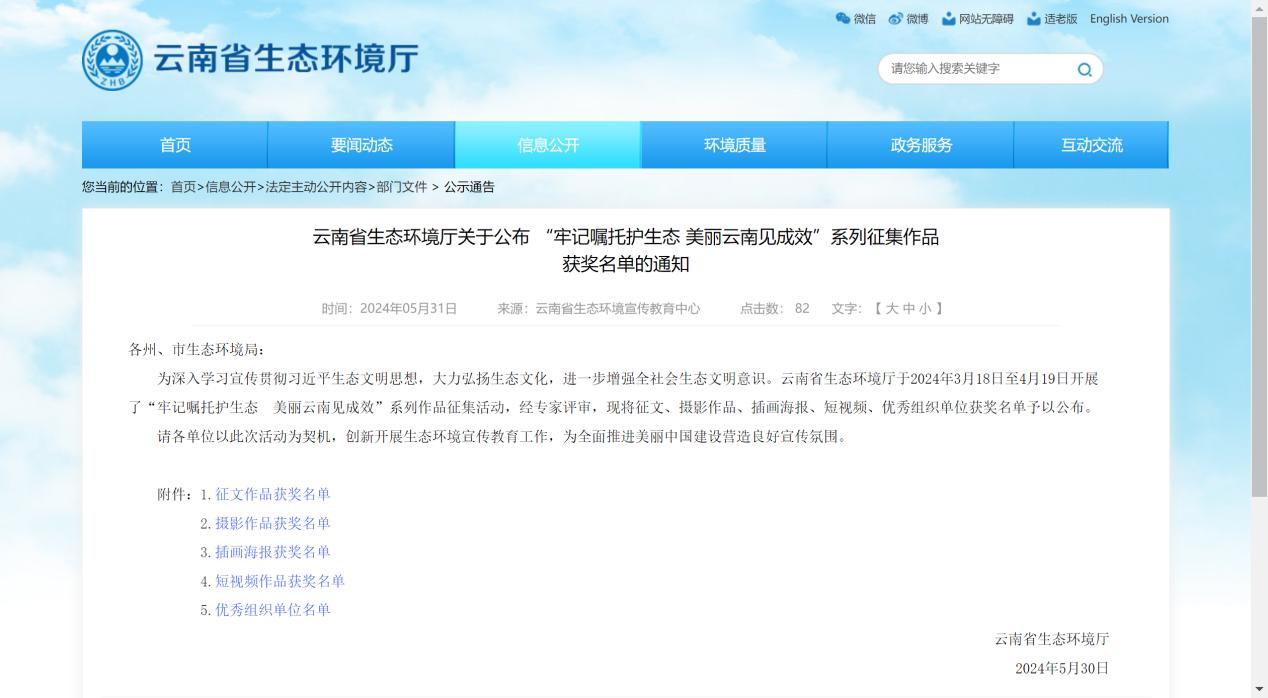5月31日,云南省生态环境厅公布了“牢记嘱托护生态 美丽云南见成效”系列征集作品获奖名单。昆明医科大学作品获得1个二等奖、1个三等奖、3个优秀奖、2个评委提名奖共7个个人作品奖项,学校荣获优秀组织单位。