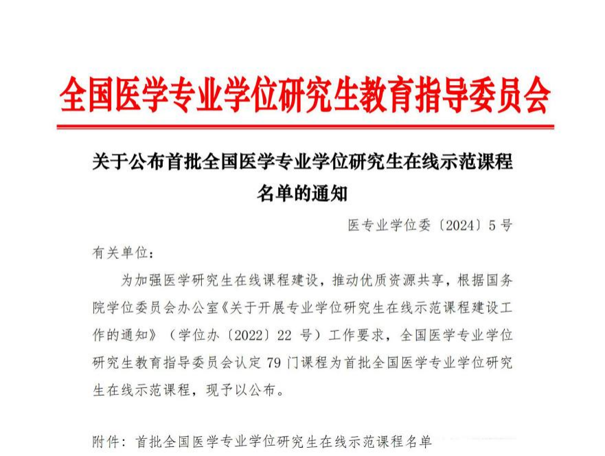 近日,根据国务院学位委员会办公室《关于开展专业学位研究生在线示范课程建设工作的通知》(学位办〔2022〕22号)精神,全国医学专业学位研究生教育指导委员会认定79门课程为首批全国医学专业学位研究生在线示范课程。昆明医科大学《护理学研究方法》课程入选。