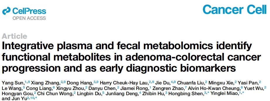 近日,昆明医科大学第一附属医院孙杨、缪应雷教授团队联合香港中文大学于君教授团队、南京医科大学沈洪兵院士团队、上海百趣代谢组学技术研究中心杜杰研究员团队,以学校为第一单位在国际顶级期刊《Cancer Cell》(IF=48.8)上发表了题为《Integrative plasma and fecal metabolomics identify functional metabolites in adenoma-colorectal cancer progression and as early diagnostic biomarkers》的论文,并被选为该期封面文章。实现学校在三大科技期刊(Cell、Nature、Science)之一Cell的大子刊上发表重要研究成果的再次突破,标志着学校在科技创新赋能高质量发展方面取得新成效。