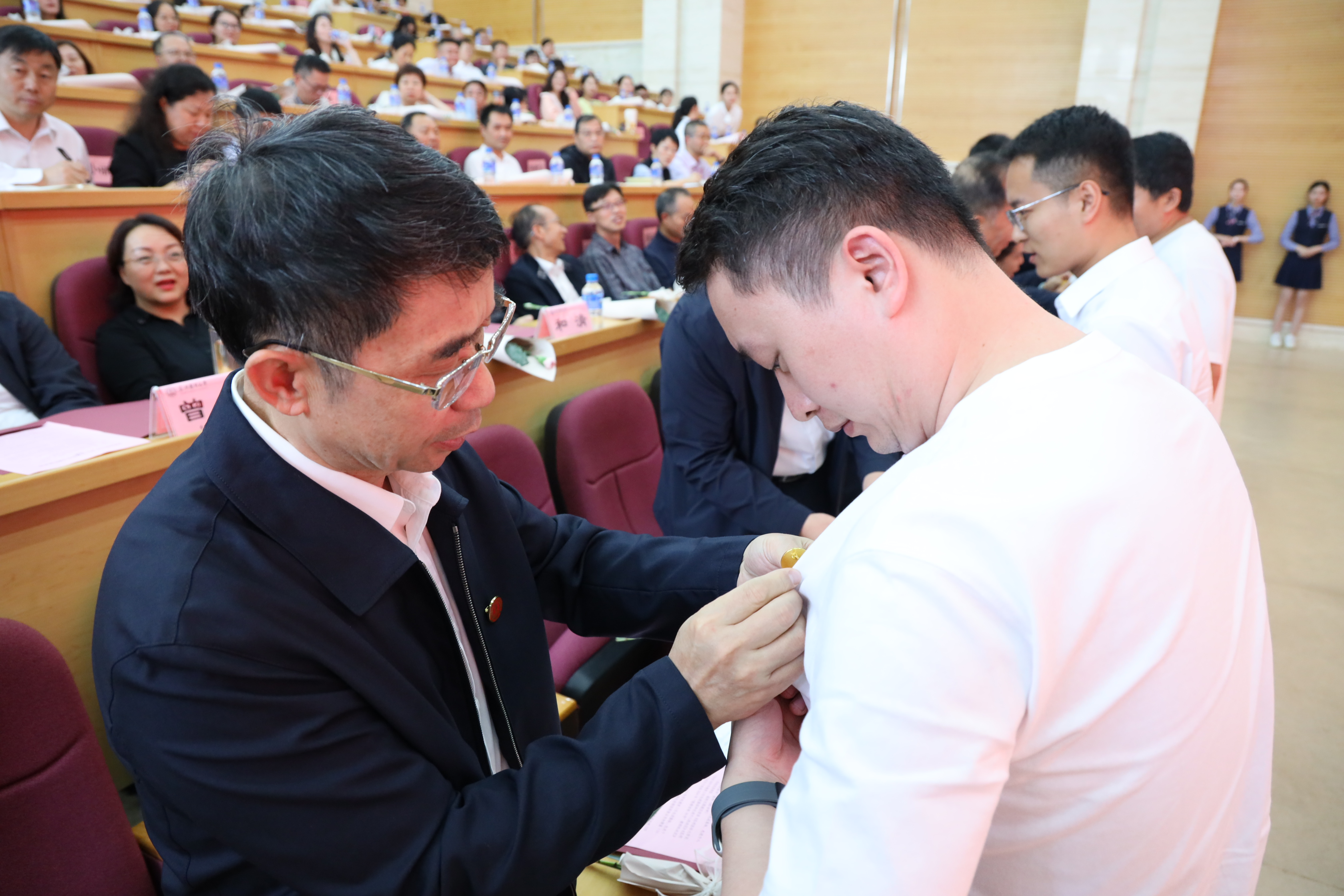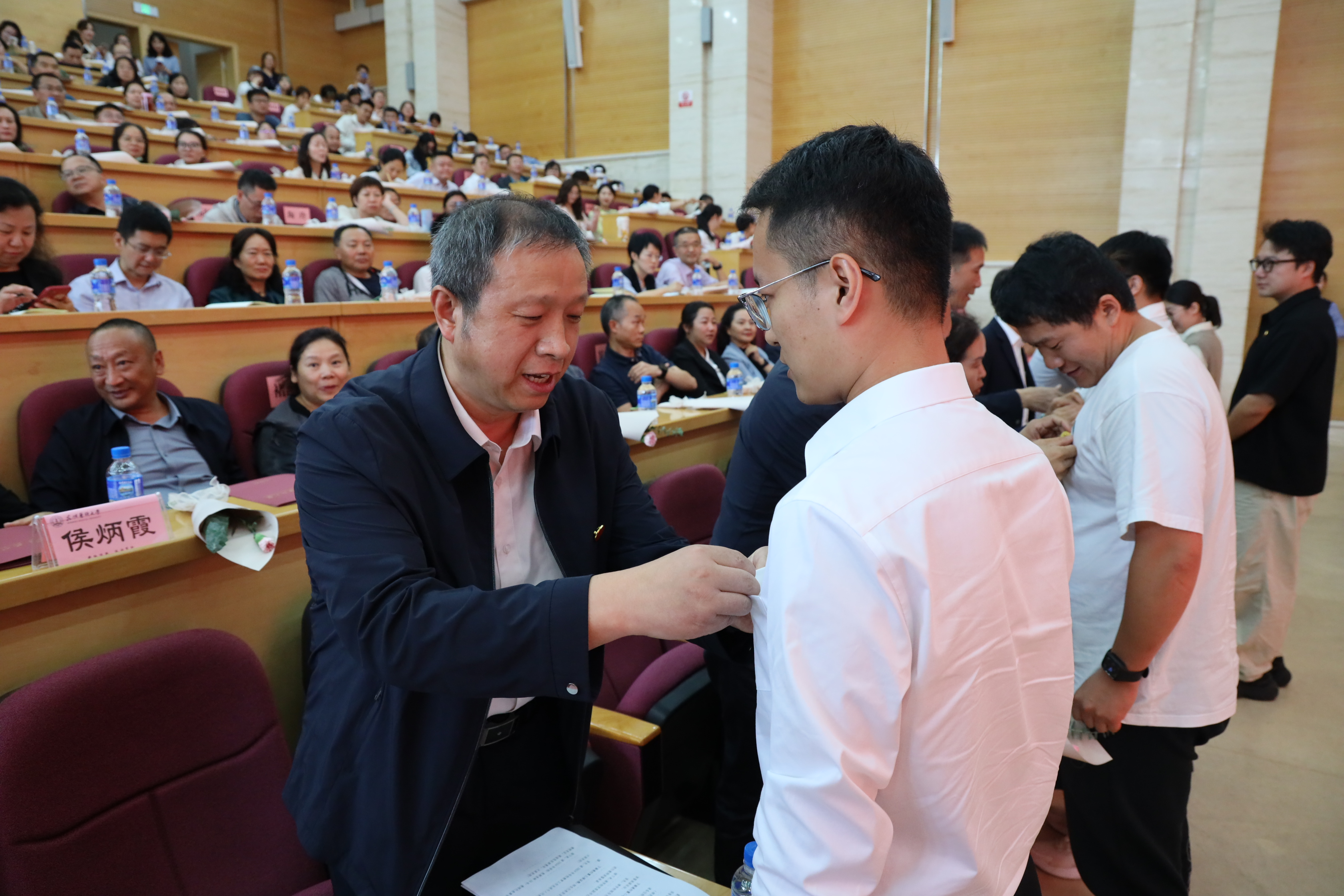 活动上,学校领导为2024年新入职教师代表佩戴校徽。