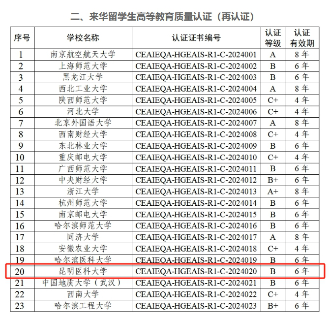 近日,中国教育国际交流协会发布关于2024上半年来华留学质量认证结果的公告,昆明医科大学通过来华留学生高等教育质量再认证,获得认证等级“B级”,认证有效期为6年,成为云南省首家通过再认证的高校。