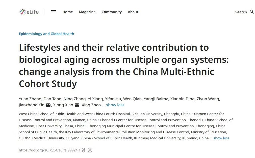 近日,四川大学肖雄副研究员团队和昆明医科大学殷建忠教授团队在生物学科领域顶级学术期刊eLife(中科院一区TOP期刊)发表了题为“Lifestyles and their relative contribution to biological aging across multiple organ systems: change analysis from the China Multi-Ethnic Cohort Study”的研究论文。
