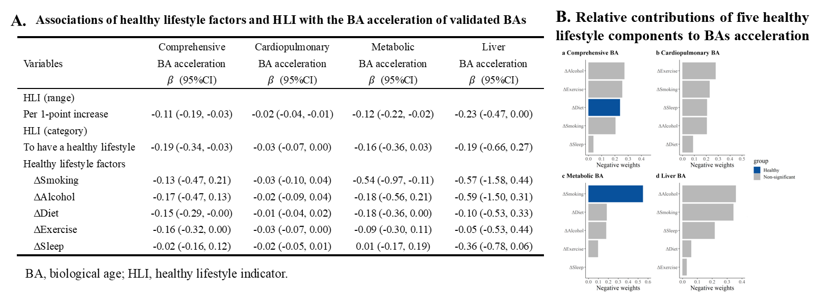 研究纳入了来自西南队列的8396名调查对象,使用五个生活方式因素(吸烟、饮酒、饮食、锻炼和睡眠)构建健康生活方式指数,使用Klemera-Doubal算法计算了全身和多器官系统BA并完成验证。采用固定效应模型分析了健康生活方式指数及其各组成部分与BA加速之间的关联,进一步使用分位数G估计评估生活方式各组成部分对BA的相对贡献。研究发现健康生活方式指数的改变与所有BA加速呈保护性关联,全身BA的平均变化为-0.19(95%CI: -0.34, -0.03),特别是在全身和代谢BA的延缓上,饮食和吸烟是影响最大的两个因素。其中,饮食对全身生物年龄的贡献率为24%,而吸烟对代谢系统老化的贡献率高达55%。