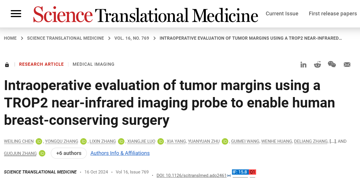 近日,昆明医科大学第三附属医院张国君教授作为唯一通讯作者在Science子刊《Science Translational Medicine》(影响因子15.8分)发表了题为Intraoperative evaluation of tumor margins using a TROP2 near infrared imaging probe to enable human breast-conserving surgery的研究论文。张国君教授团队的博士研究生陈伟玲、硕士研究生张莉欣、汕头大学医学院附属肿瘤医院张永渠教授为论文的共同第一作者。该研究成果标志着学校在组织实施科技工作高质量内涵式发展方面取得了重要进展。