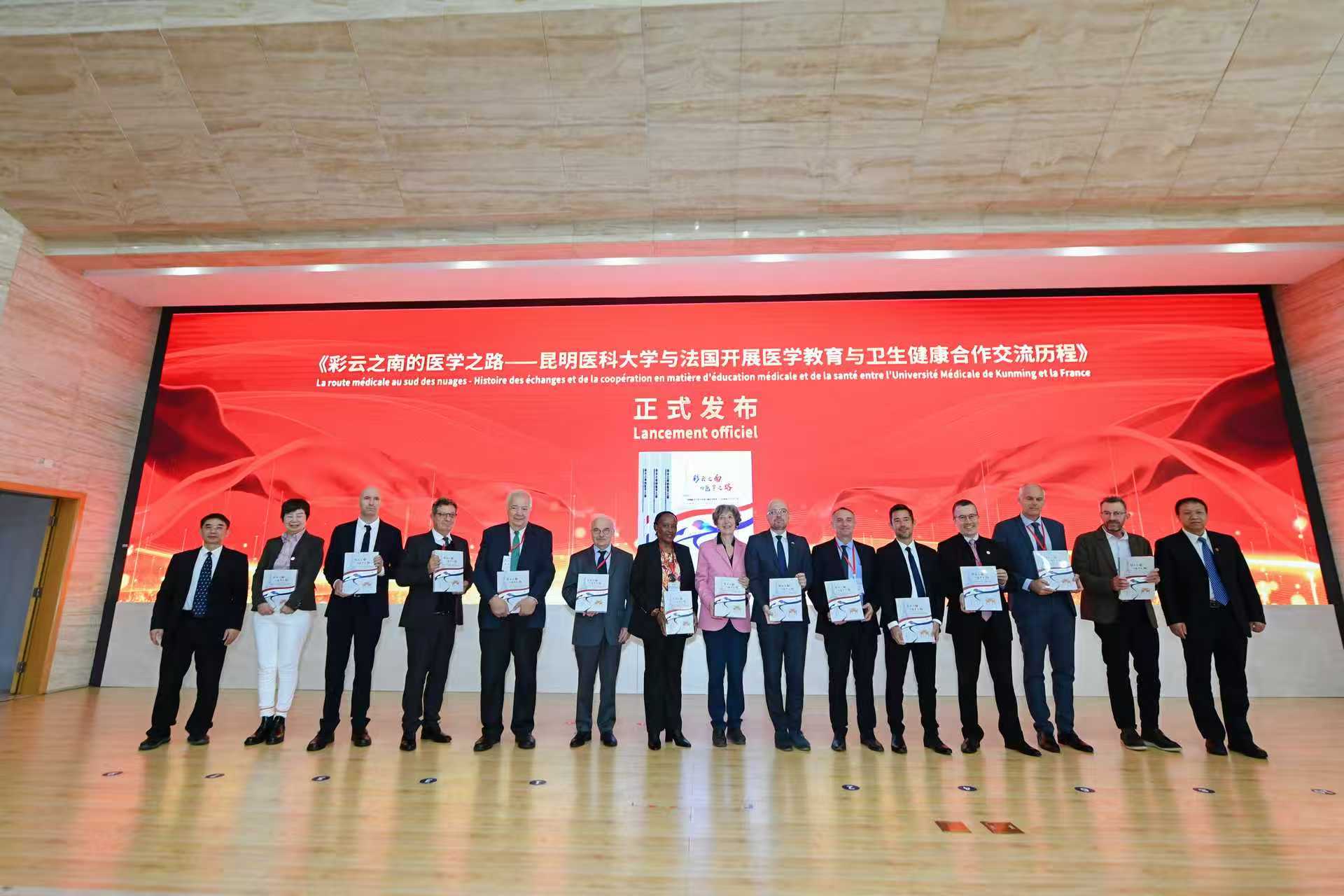 记录滇法医学教育合作历程的专著《彩云之南的医学之路》在开幕式上正式发布。该书历时近两年编撰,以中、法、英三语呈现,收录五万余字与上百幅珍贵影像,系统梳理并展现了昆明医科大学与法国各界在医学教育领域的友好交往与丰硕成果,不仅具有重要的史料价值,也成为中法医学交流史上的一座里程碑。尹向阳和夏雪山向与会的中外嘉宾代表赠送书籍。
