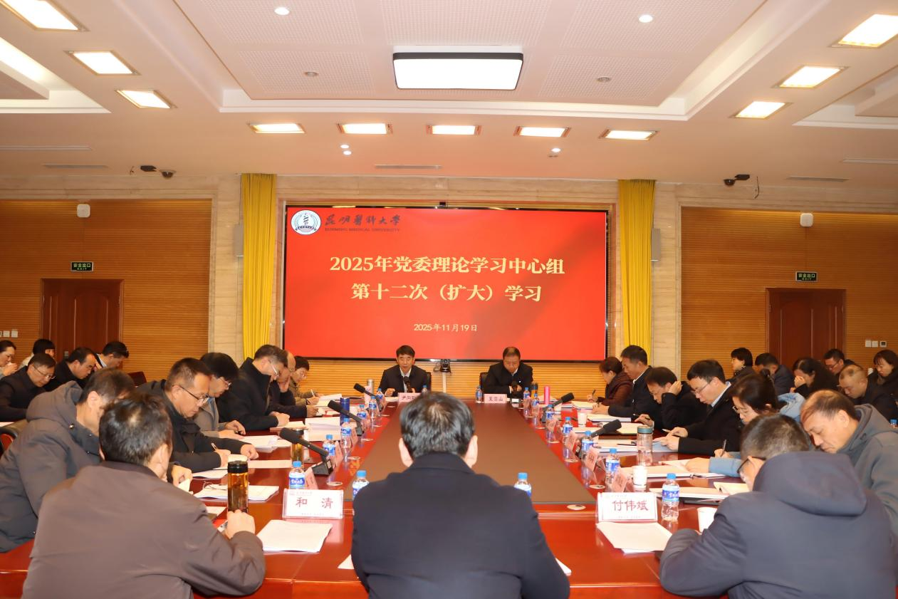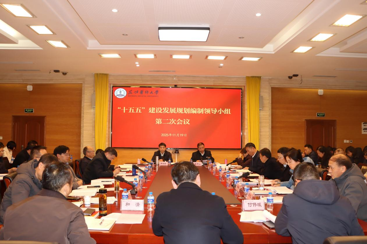 11月19日,昆明医科大学党委理论学习中心组2025年第十二次(扩大)学习暨“十五五”建设发展规划编制领导小组第二次会议在呈贡校区召开,会议深入学习贯彻党的二十届四中全会精神,紧密结合习近平总书记考察云南重要讲话重要指示精神,聚焦学校改革发展关键环节,切实把学习成果转化为服务国家和云南省“十五五”时期经济社会发展的强大动力,确保学校“十四五”建设发展规划顺利收官、高水平编制好“十五五”建设发展规划,推动学校“十五五”时期高质量发展开好局、起好步。