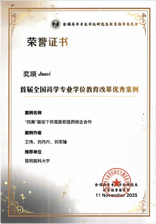 据悉,获奖案例是昆明医科大学与昆药集团股份有限公司自2022年11月以来合作建设“云南省产教融合研究生联合培养基地——医药企业药学类专业学位研究生联合培养基地”的标志性成果之一,也是学校2024年12月开始实施云南省省级立项药学博士专业学位授权点建设项目取得的阶段性成果,案例充分展现了学校校企合作、实践育人在促进药学高等教育和药学产业发展中的成功经验。