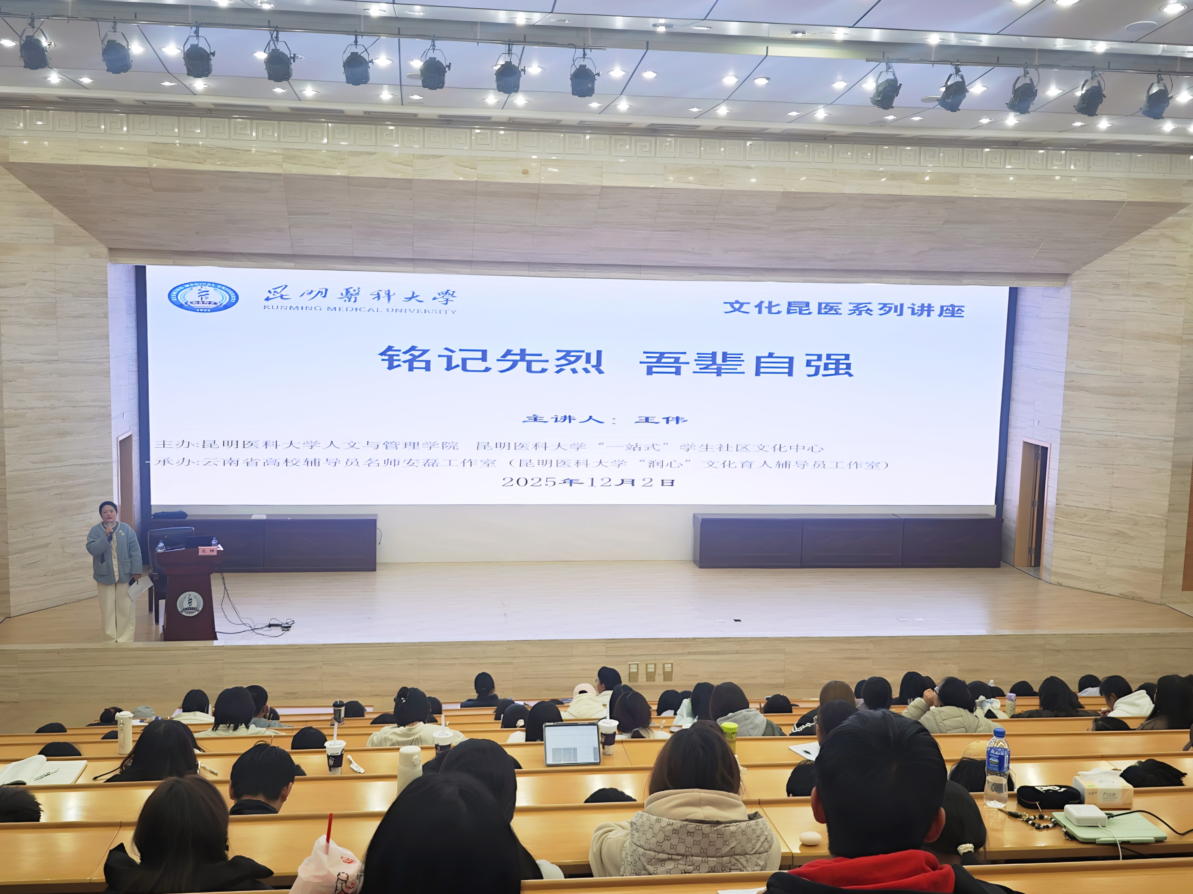12月2日,由昆明医科大学“一站式”学生社区文化中心、人文与管理学院主办,云南省高校辅导员名师安磊工作室承办的“铭记先烈 吾辈自强 传承和弘扬伟大抗战精神 实现中华民族伟大复兴”专题讲座在学术交流中心第一报告厅举行。牺牲在淞沪会战中的著名抗日英烈杨杰将军后人、云南黄埔同学会会员、中国电信云南公司原副总经理、中国电信党校“长青讲师团”讲师王伟受邀主讲。学校300余名师生参加讲座。
