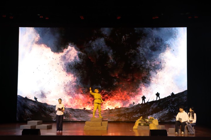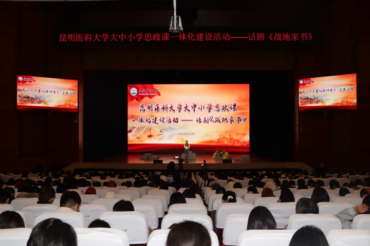 为深入学习贯彻习近平新时代中国特色社会主义思想,大力弘扬中国共产党人精神谱系,传承红色基因,赓续伟大抗战精神、抗美援朝精神、老山精神,12月11日,由昆明医科大学、云南省退役军人事务厅和共青团云南省委员会共同主办的“云岭铭英烈”话剧思政课“五进”活动之精品话剧《战地家书》在昆明医科大学演出。本次活动旨在通过沉浸式的艺术体验,激发广大青年学子的爱国情怀与责任担当,落实立德树人根本任务,为培养担当民族复兴大任的时代新人注入强大精神动力。
