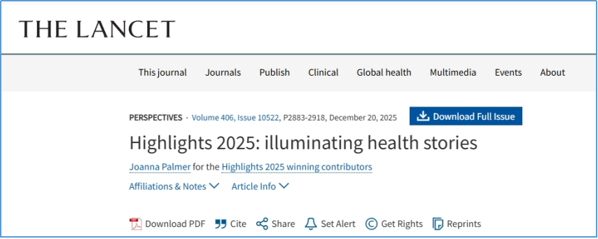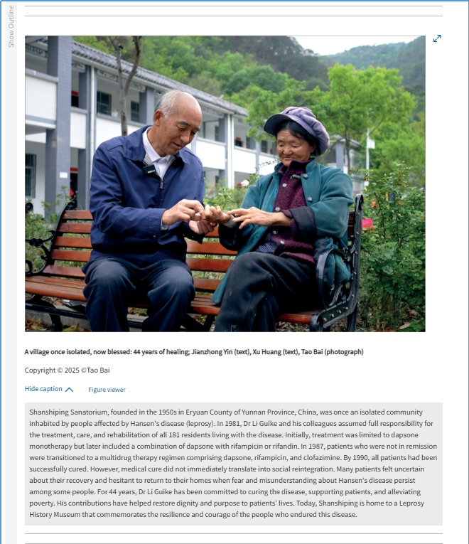 近日,昆明医科大学医学人文作品《A village once isolated, now blessed: 44 years of healing》入选《柳叶刀》Highlights 2025(The Lancet for Highlights 2025)并在视角(Perspectives)栏目发表。该作品由学校殷建忠、黄旭、白涛3位教师共同合作完成,是学校首次入选《柳叶刀》Highlights作品。