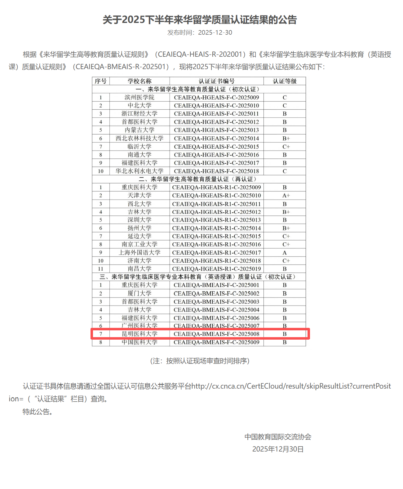 12月30日,中国教育国际交流协会官网公布了2025下半年来华留学质量认证结果,昆明医科大学通过来华留学生临床医学专业本科教育(英语授课)质量认证(BMEAIS),认证等级为B级,有效期5年。至此,学校成为云南省唯一通过来华留学生临床医学专业本科教育(英语授课)质量认证及来华留学生高等教育质量再认证高校。