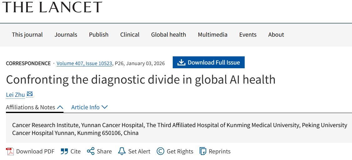 近日,昆明医科大学第三附属医院教师朱磊在国际顶级医学期刊《柳叶刀》(The Lancet)Correspondence专栏发表了题为《Confronting the diagnostic divide in global AI health》的通信文章。该文聚焦全球人工智能(AI)医疗发展中的一个深刻矛盾:当全球近一半人口尚无法获得基本诊断服务时,主流AI医疗研究可能在无意中加剧这一不平等,而非弥合它。文章呼吁全球学界进行战略转向,致力于发展“公平优先的AI”(equity-first AI)。