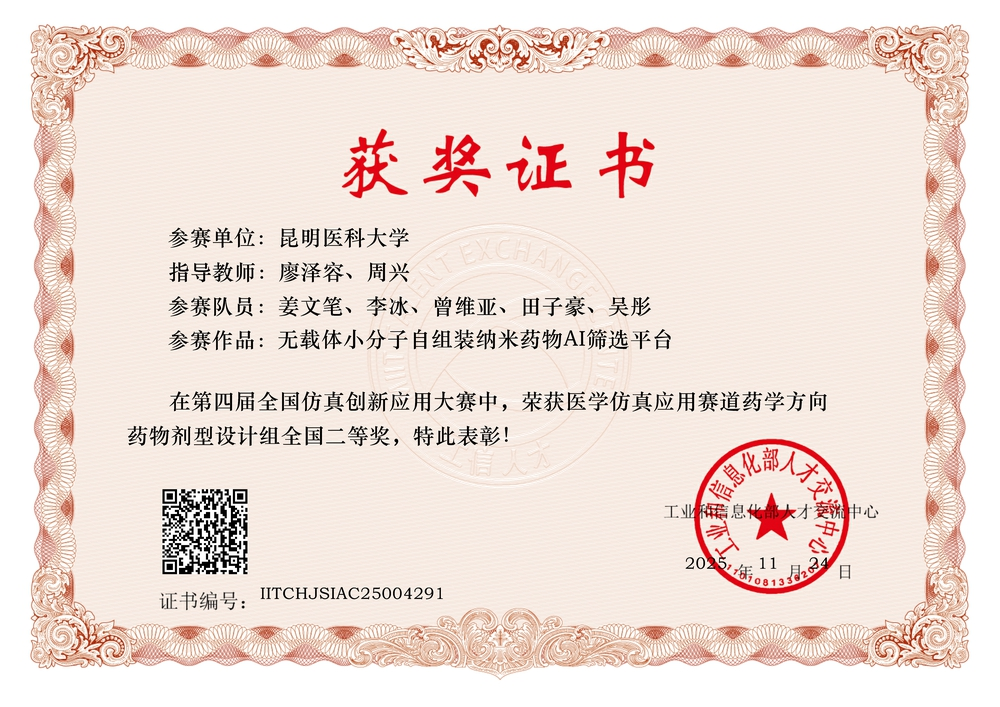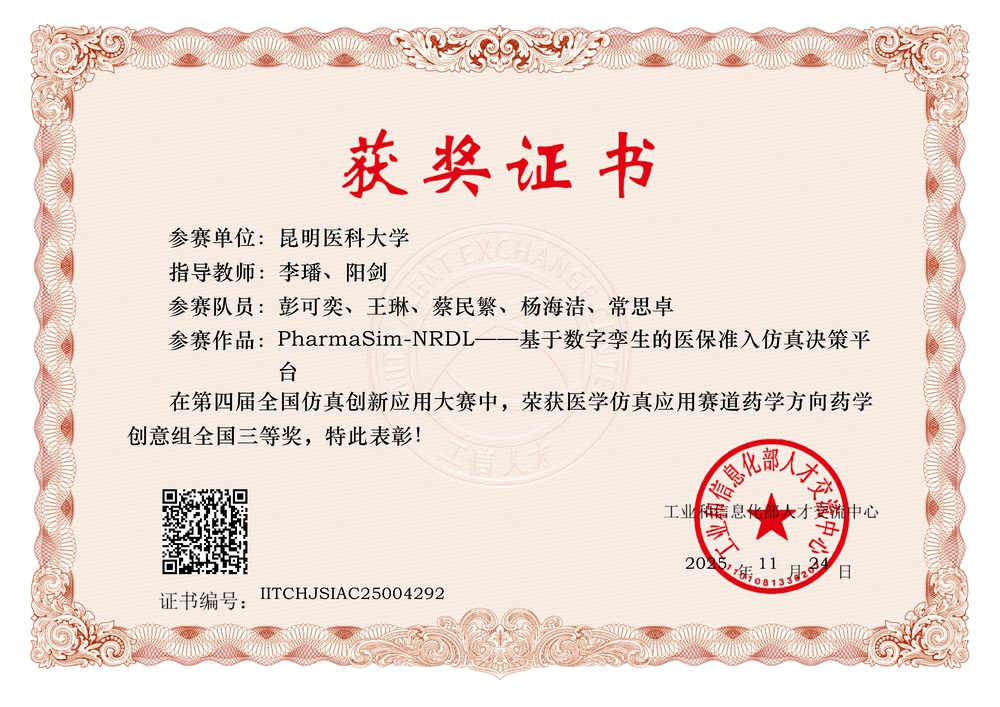 昆明医科大学高度重视本次赛事,依托学校在医药健康领域的学科优势,积极推动仿真技术与人才培养、医学研究和产业需求的深度融合,精心组建参赛团队。康复学院和药学院参赛团队凭借鲜明的学科交叉特色和前瞻性的技术路径,代表学校参加云南省赛区比赛,均获省级一等奖,并成功晋级全国总决赛。最终,学校两支参赛团队从全国近500支晋级队伍中脱颖而出,康复学院代表团队的参赛作品《无载体小分子自组装纳米药物AI筛选平台》荣获药物剂型设计组全国二等奖,药学院代表团队的参赛作品《PharmaSim-NRDL——基于数字孪生的医保准入仿真决策平台》荣获药学创意组全国三等奖。