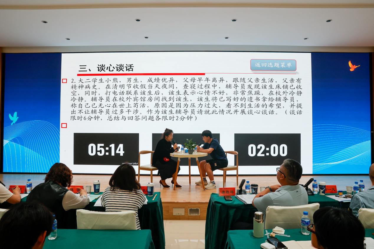 决赛阶段分为学情分析、案例研讨和谈心谈话3个环节,10位辅导员紧扣学生工作实际,将理论融入实践,通过研讨、剖析与谈话,再现了辅导员日常工作的点滴瞬间。