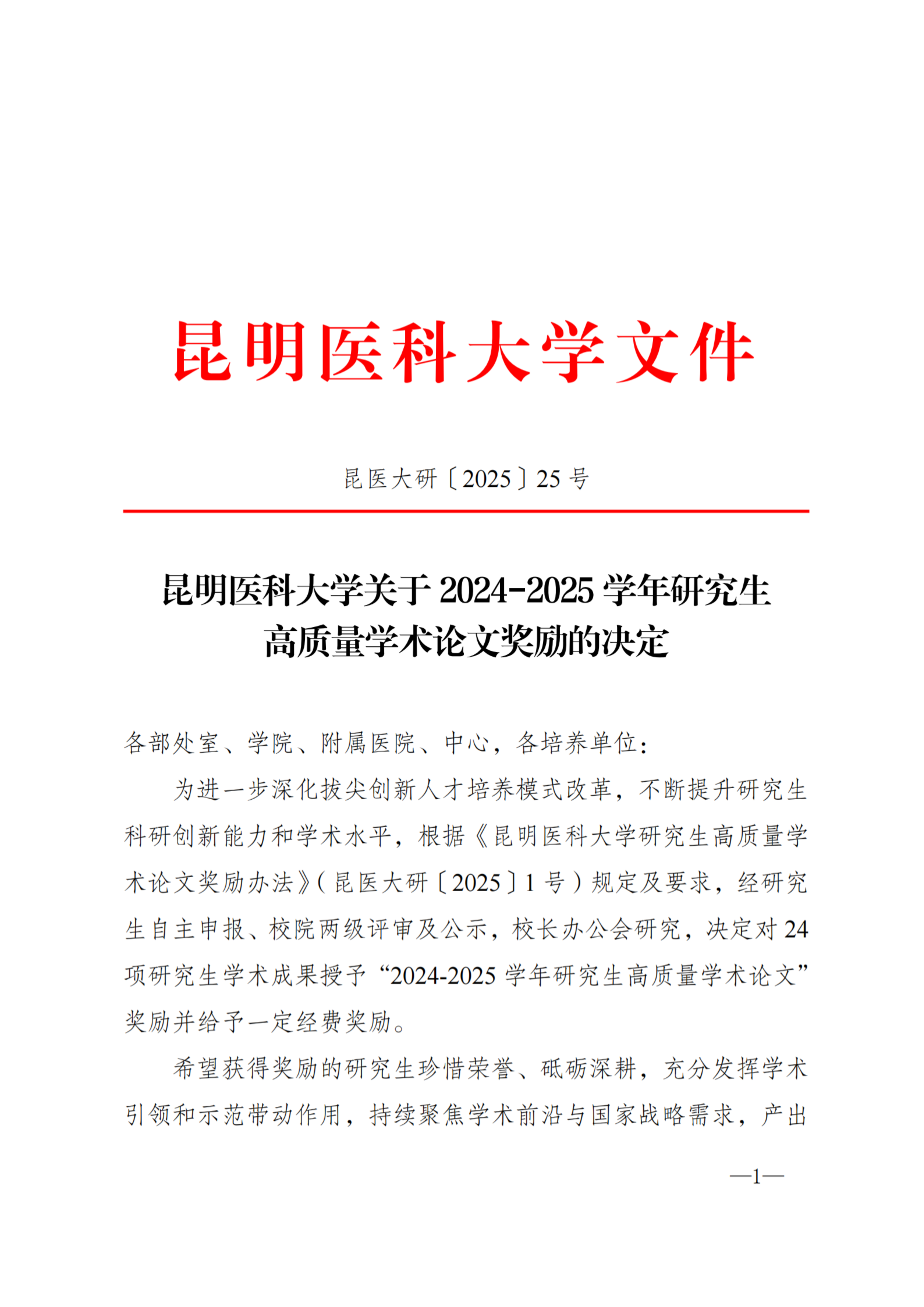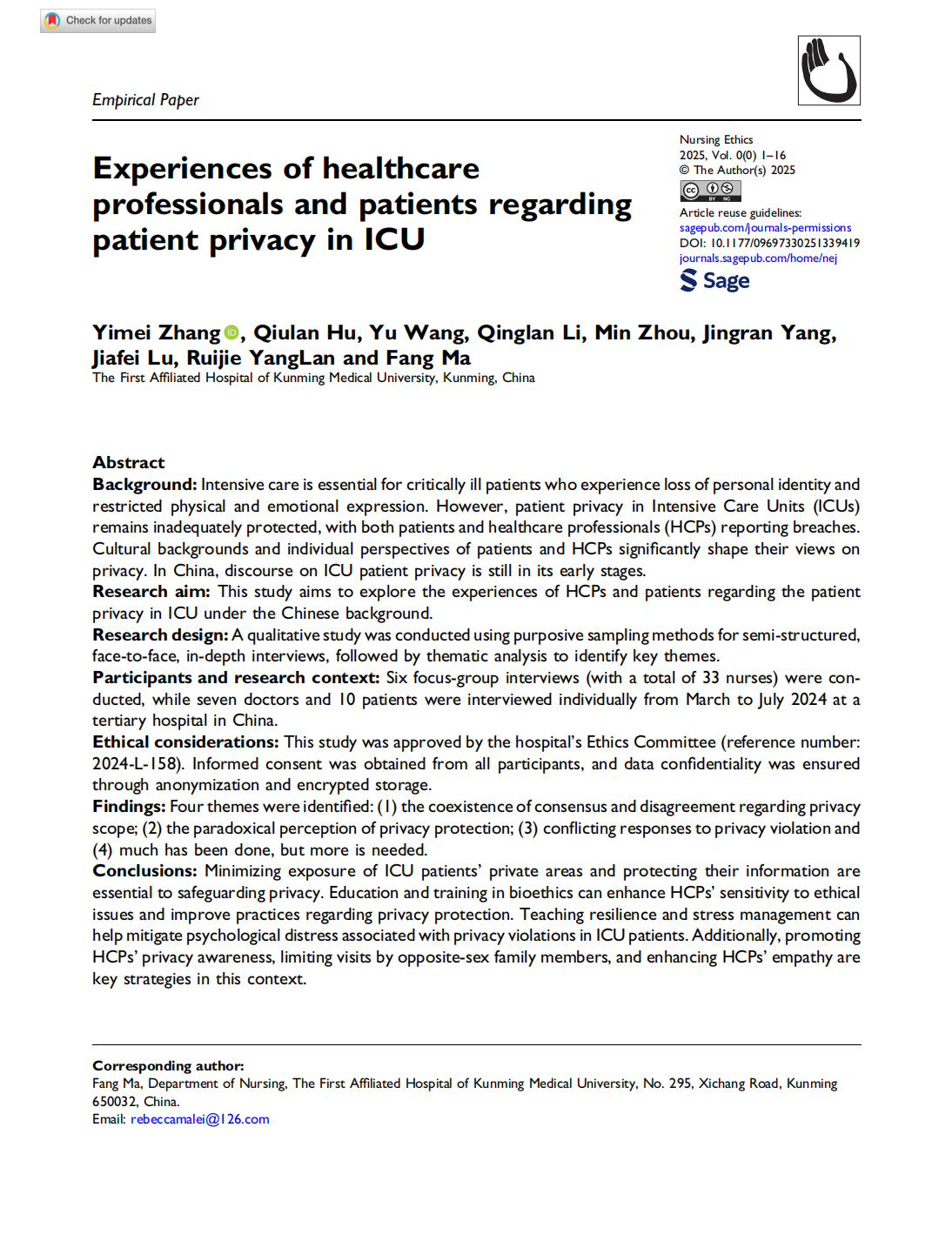 近日,昆明医科大学正式公布了年度研究生高质量学术论文奖励名单。我院2025届硕士研究生张义美(第一作者)在导师马芳(通讯作者)指导下完成的论文《Experiences of healthcare professionals and patients regarding patient privacy in ICU》经过严格评审,成功入选并获得该年度研究生高质量学术论文奖励,为学院研究生培养工作再添亮眼成绩。