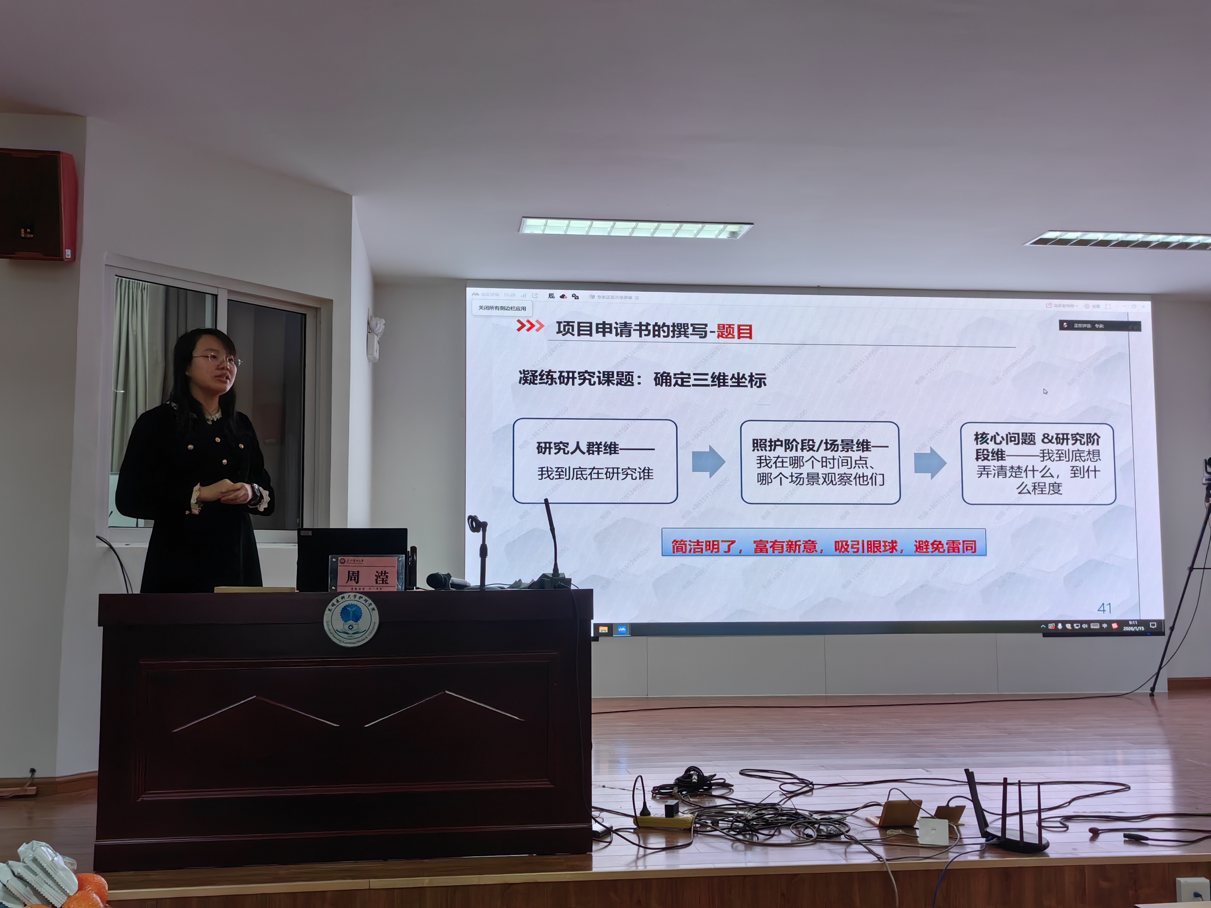 1月15-16日,昆明医科大学护理学院2026年第一期“海棠护理”学术论坛暨科研专题培训在呈贡校区举办,特邀上海健康医学院教授董恩宏、云南财经大学副教授陈龙、北京协和医院博士赵亚芳、上海交通大学博士周滢,围绕国家级课题申报经验及科研成果转化进行专题讲座。院长卢玉林、党委副书记聂兆祥、副院长陶慧、杨倩蓉、护理学科导师、专任教师、研究生等200余人线上线下参会。杨倩蓉主持会议。