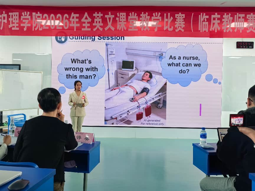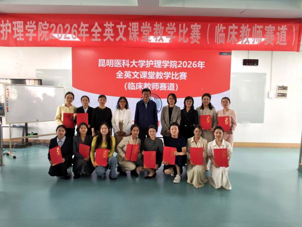 为提升临床护理教师教育教学国际化视野和国际交流能力,加强教师全英文教学能力培养,昆明医科大学护理学院于4月16日在呈贡校区明德楼401教室举行2026年全英文课堂教学比赛。昆明医科大学教学质量监控与评估中心原主任、校级督导专家于建云教授担任评委组组长。经过各实践教学单位初赛严格选拔推荐的12名临床护理教师参加了比赛。