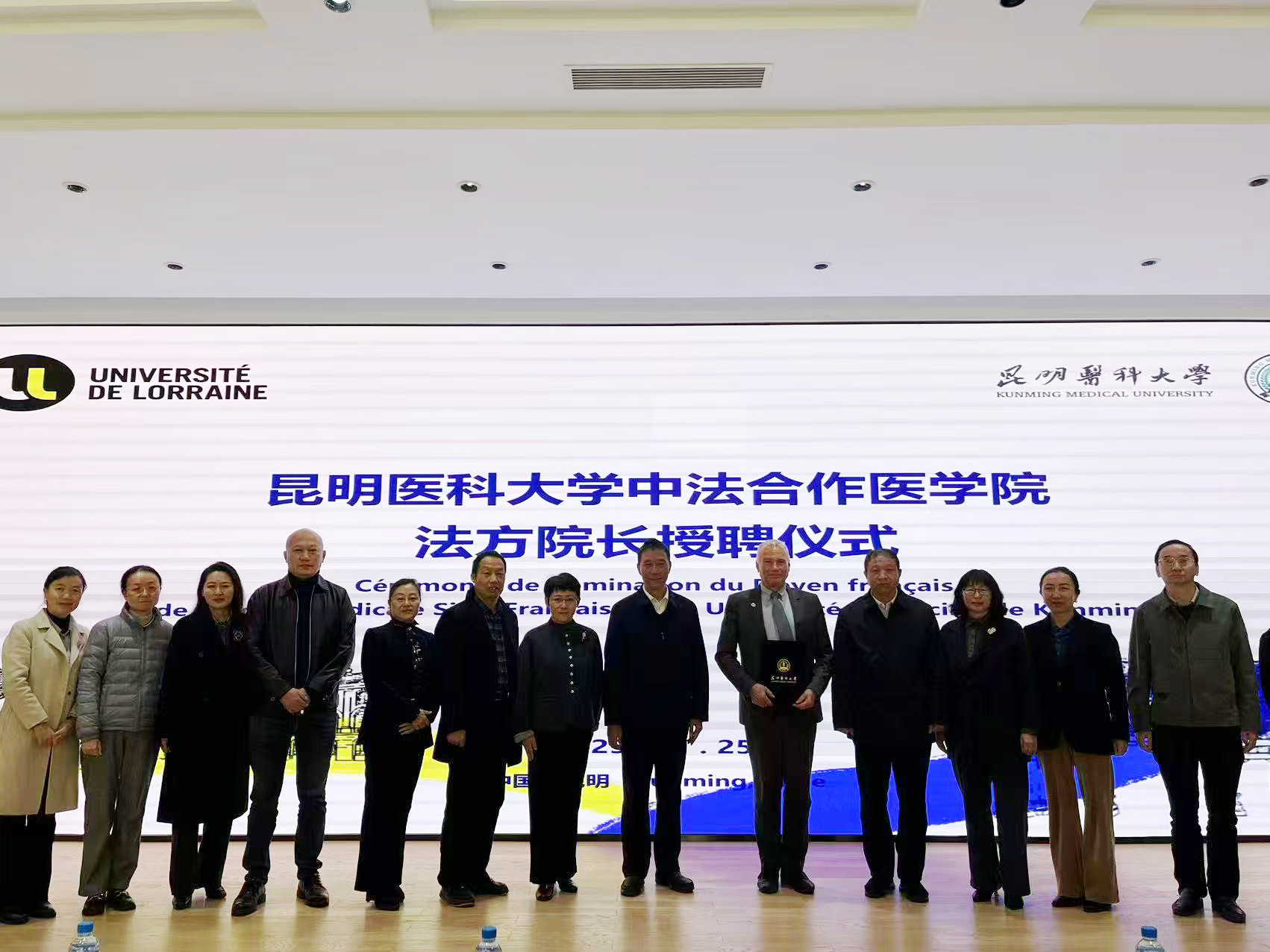 2025年11月25日上午,昆明医科大学在呈贡校区学术交流中心第二报告厅举行中法合作医学院法方院长授聘仪式,并邀请法国洛林大学南锡医学院荣誉院长Marc Braun(马克·布劳恩)教授作专题讲座。此次活动标志着学校在推进中法医学教育合作和国际化办学方面迈出重要一步。