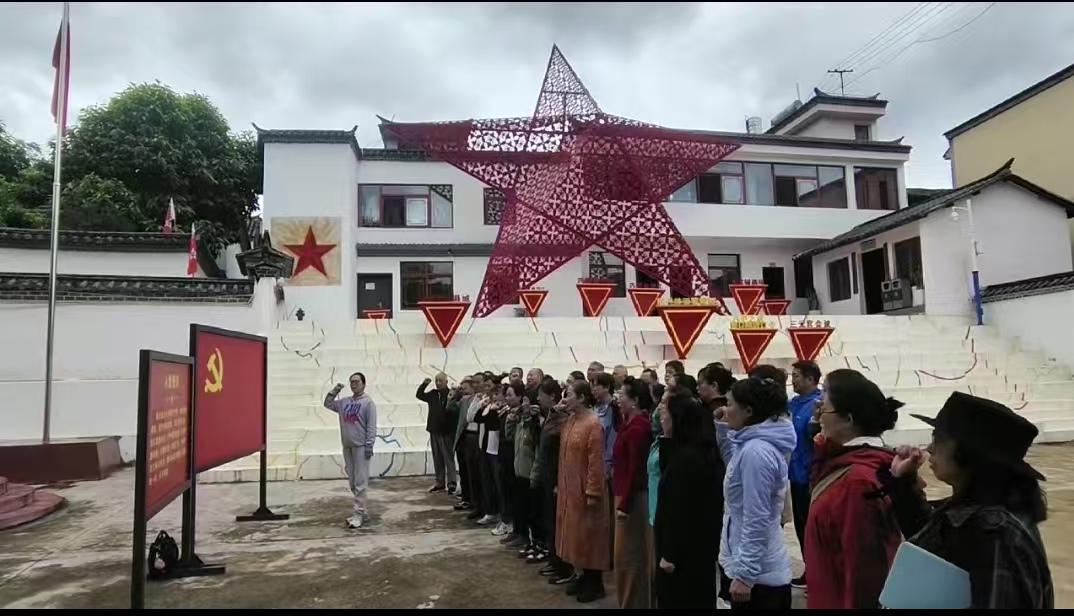 在讲解员的引导下,老同志们认真观看了树桔红军渡纪念馆内陈列的历史照片、革命文物和文献资料。大家在一件件珍贵实物前驻足凝视,仔细聆听讲解,深刻感受红军长征途经此地时与人民群众结下的深厚情谊,以及革命先辈坚定的理想信念和不怕牺牲的英雄气概。次日,队伍继续前往具有重要历史意义的柯渡红军纪念馆——这里曾是中央红军长征总部的驻地。老同志们参观了毛泽东、周恩来、朱德等老一辈革命家曾经工作和生活的场所,观看了记录红军长征过云南、过柯渡的详实史料与影像。通过讲解员生动细致的介绍,大家仿佛重回那段烽火岁月,深切体会到长征的艰难曲折与伟大转折,感受到革命领袖运筹帷幄、决胜千里的智慧与魄力。在党旗前,全体党员庄严宣誓,重温入党誓词,铿锵誓言表达了退休党员不忘初心、牢记使命、永远跟党走的坚定信念。