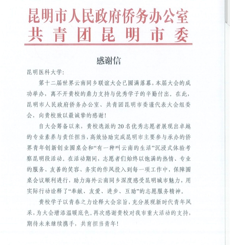 近日,我校收到了一封来自昆明市人民政府侨务办公室和共青团昆明市委的感谢信。来信中提到,我校优秀学生志愿者在第十二届世界云南同乡联谊大会中展现出卓越的专业素养和责任担当。并对在活动期间,我校志愿者展现出的饱满的热情、专业的服务、友善的笑容、务实的作风予以肯定和赞扬。这不仅是对我校参与大会活动的青年志愿者的表彰,更是对我校一直以来重视培养有担当、有社会责任感、乐于奉献的青年学子的肯定。